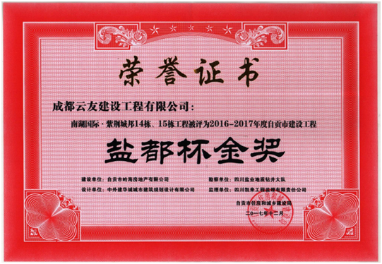 熱烈祝賀四川中和達(dá)集團有限公司旗下子公司成都云友建設(shè)工程有限公司,承建的南湖國際·紫荊城邦14棟、15棟項目,于2017年12月被評為2016-2017年度自貢市建設(shè)工程“鹽都杯金獎”。