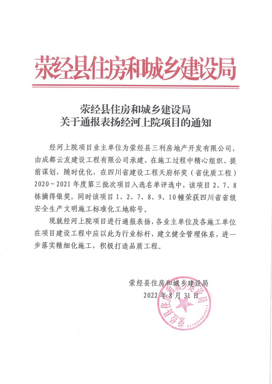 2022年9月3日,滎經(jīng)縣住房和城鄉(xiāng)建設(shè)局發(fā)布了《關(guān)于通報表揚經(jīng)河上院項目的通知》,通知全文表揚了集團旗下成都云友建設(shè)工程有限公司承建的“經(jīng)河上院”項目獲得了“四川省建設(shè)工程天府杯銀獎(省優(yōu)質(zhì)工程)”及“四川省省級安全生產(chǎn)文明施工標(biāo)準(zhǔn)化工地稱號”。將經(jīng)河上院項目定為行業(yè)標(biāo)桿并號召縣域各工程建設(shè)、施工單位對標(biāo)學(xué)習(xí)。