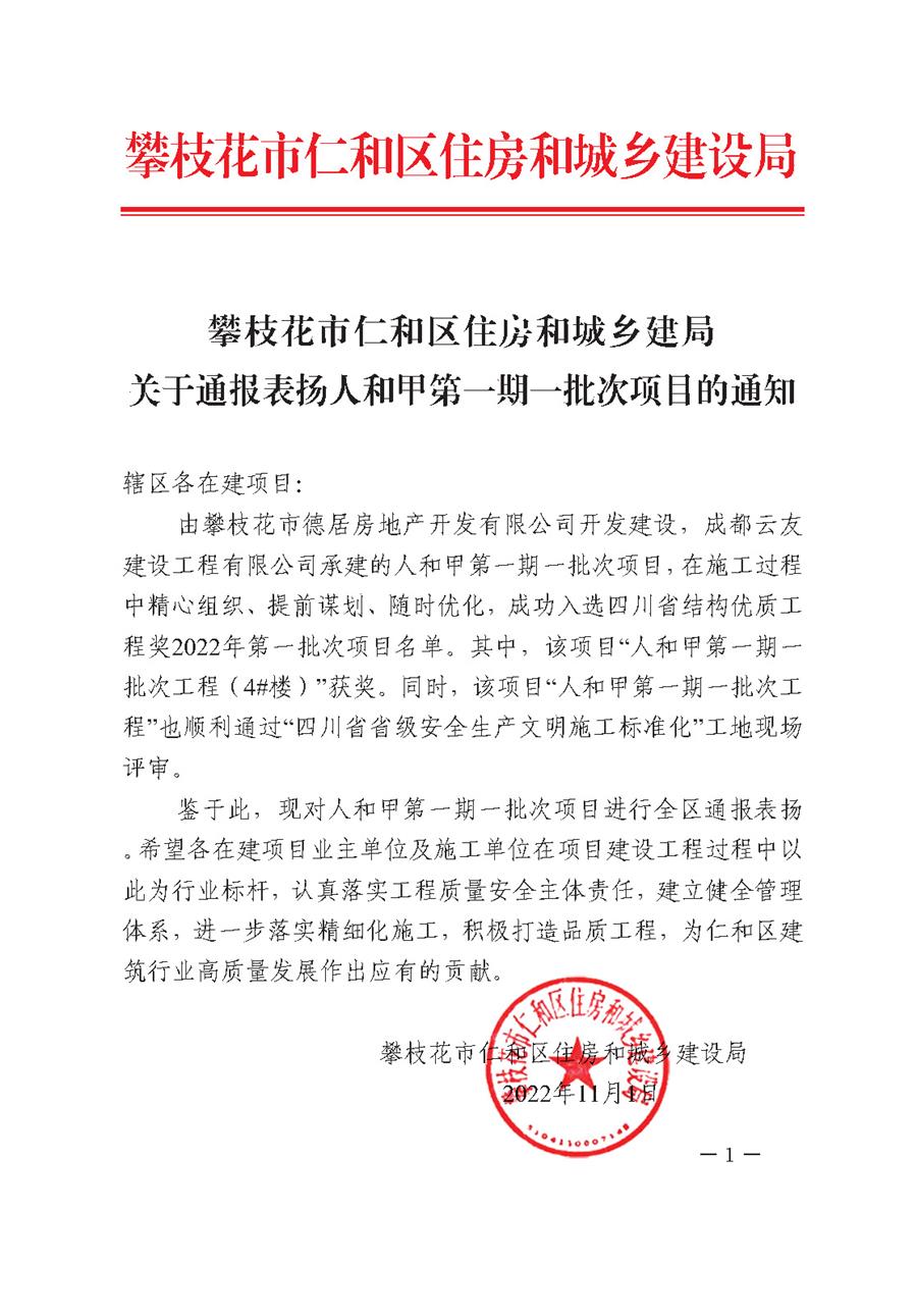 2022年11月1日,攀枝花市仁和區(qū)住房和城鄉(xiāng)建設(shè)局發(fā)布了《關(guān)于通報表揚人和甲第一期一批次項目的通知》,通知表揚了集團旗下攀枝花市德居房地產(chǎn)開發(fā)有限公司投資建設(shè)、成都云友建設(shè)工程有限公司承建的“人和甲第一期一批次”項目。該工程項目順利通過“四川省省級安全生產(chǎn)文明施工標(biāo)準(zhǔn)化工地”現(xiàn)場評審,其4#樓榮獲“四川省結(jié)構(gòu)優(yōu)質(zhì)工程獎”。全文肯定了“人和甲第一期一批次工程”在施工過程中精心組織、提前謀劃、隨時優(yōu)化,并在全區(qū)提出通報表揚,為仁和區(qū)建筑行業(yè)高質(zhì)量發(fā)展作出應(yīng)有的貢獻。